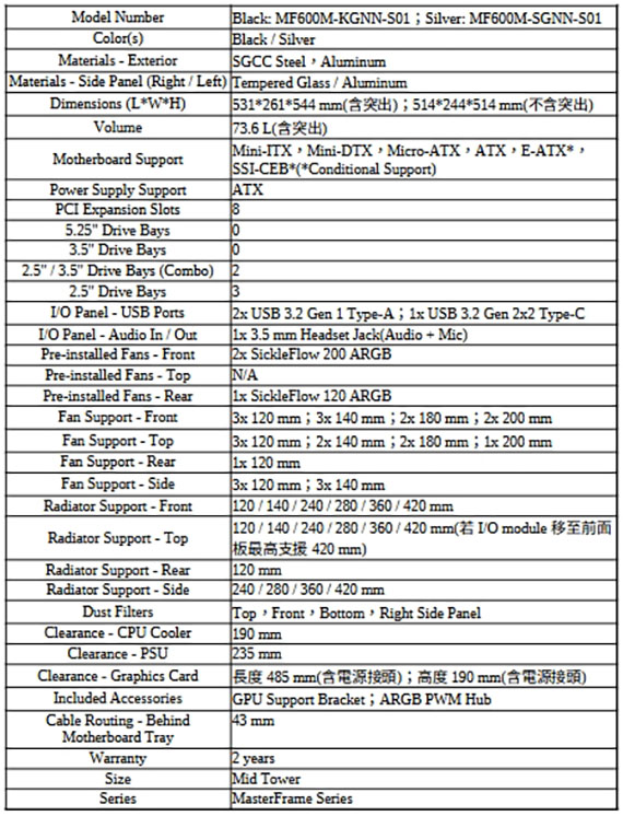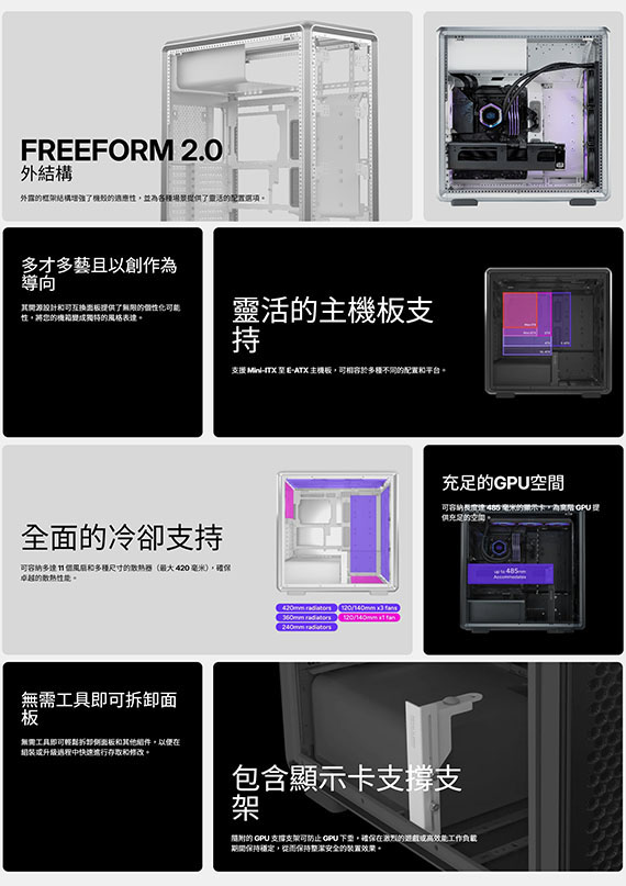 2.5吋/3.5吋(複合式)*2,2.5吋*3,適用主機板:Mini-ITX/Mini-DTX/Micro-ATX/ATX/E-ATX(支援背插式主機板),PCIE擴充槽*8,支援CPU散熱限高190mm,顯卡GPU限長485mm,電源供應器PSU限長235mm,支援風扇(無標示內建即選購):前版120mm*3/140mm*3/180mm*2/200mm*2,上板120mm*3/140mm*2/180mm*2/200mm*1,後板120mm*1,側板120mm*3/140mm*3,支援水冷(無標示內建即選購):前板120/140/240/280/360/420mm,上板120/140/240/280/360/420mm,後板120mm,側板240/280/360/420mm,I/O介面:Type A USB 3.2 Gen 1*2,Type C USB 3.2 Gen 2*2,Type C*1,1*3.5mm,二年保固