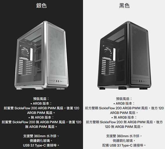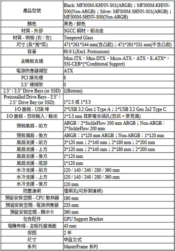 3.5吋*1,2.5吋*1,適用主機板:Mini-ITX/Mini-DTX/Micro-ATX/ATX/E-ATX(支援背插式主機板),PCIE擴充槽*8,支援CPU散熱限高190mm,顯卡GPU限長390mm,電源供應器PSU限長235mm,支援風扇(無標示內建即選購):前版120mm*3/140mm*2/180mm*2/200mm*2,上板120mm*3/140mm*2/180mm*2/200mm*2,後板120mm*1,底板120mm*1,支援水冷(無標示內建即選購):前板120/140/240/280/360mm,上板120/140/240/280/360mm,後板120mm,I/O介面:Type A USB 3.2 Gen 1*2,Type C USB 3.2 Gen 2*2,3.5mm*1,無需工具的面板拆除,附帶的GPU支援範圍,二年保固