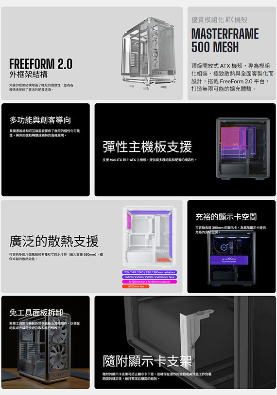 MasterFrame 500 Mesh 是一款頂級的開放式中塔機殼,專為高效能硬體、極致散熱和全面客製化而打造。它依循 FreeForm 2.0 設計理念,支援從 ATX 到 E-ATX 的主機板,並提供模組化設計檔案的完整存取權限,讓使用者能夠不受限制地組裝與升級。