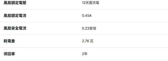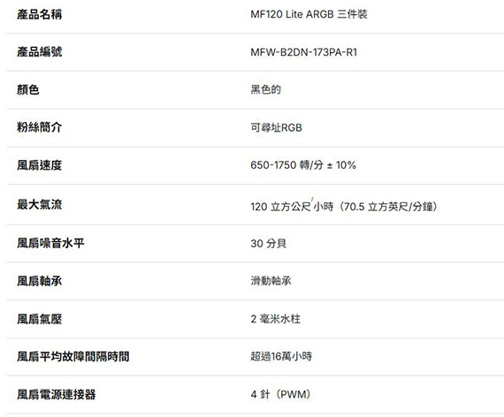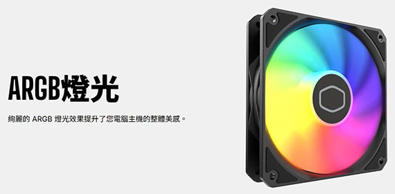 風扇轉速650-1750RPM±10%,噪音水平30dBA,Sleeve Bearing軸承,風壓2.1mmH2O,連接介面4-Pin(PWM),強化PBT框架,抗共振安裝系統,鮮豔ARGB燈效,高效散熱性能,2年保固