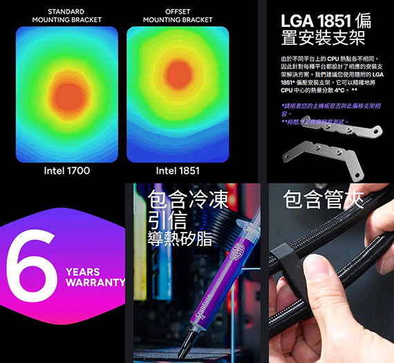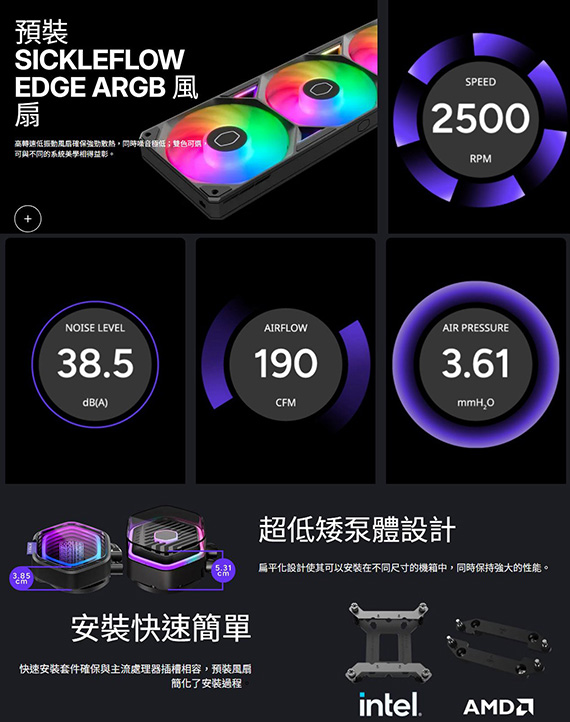 CPU腳位:Intel LGA 1851/1700/1200/1150/1151/1155/1156,AMD:AM5/AM4,風扇尺寸361x122x26.5mm,風量190CFM,轉速690 ~2500 RPM ± 15,噪音值38.5dB(A),靜壓3.61mmH2O,散熱器尺寸(含扇):394x119.2x27mm,3-Pin ARGB + 4-Pin PWM接頭,PIXEL LCD,螢幕尺寸:85.0x79.2x16mm,螢幕解析度:28x26px,超薄型泵體設計,SickleFlow Edge ARGB 一體式排扇,效能優越安裝便利,雙腔室設計,6年保固