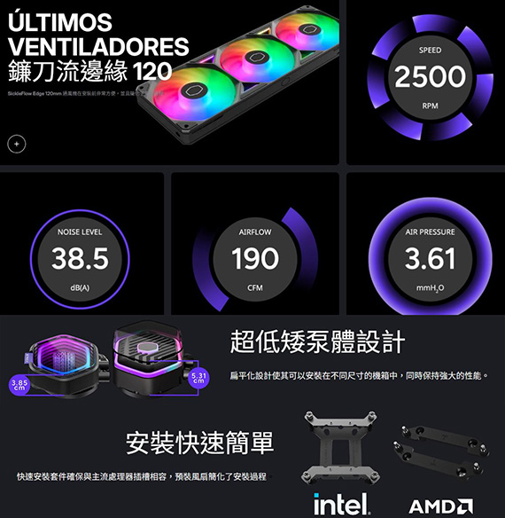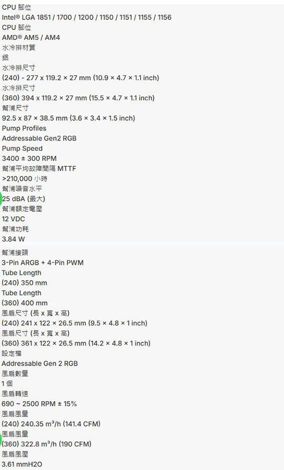 CPU腳位:Intel LGA 1851/1700/1200/1150/1151/1155/1156,AMD:AM5/AM4,風扇尺寸361x122x26.5mm,風量190CFM,轉速690 ~2500 RPM ± 15%,噪音值38.5dBA,靜壓3.61mmH2O,散熱器尺寸(含扇):394x119.2x27mm,3-Pin ARGB + 4-Pin PWM接頭,超薄型泵體設計,SickleFlow Edge ARGB 一體式排扇,效能優越安裝便利,6年保固