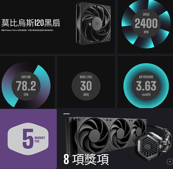 CPU腳位:LGA 1851/1700/1200/1156/1155/1151/1150,AMD:AM5/AM4,風扇尺寸120x120x25mm,風量75.2CFM,轉速2400RPM±10%,噪音值30dBA,靜壓3.63mm-H2O,散熱器尺寸(含扇):394x119.2x27.2mm,上蓋內容可完全客製,雙腔設計,專利設計,內含管狀卡夾,導熱膏貼紙,環保建築,莫比烏斯120黑扇,5年保固