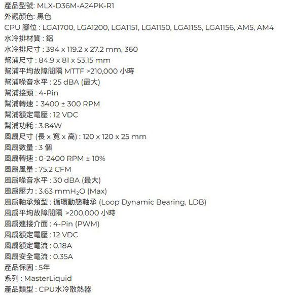 CoolerMaster MasterLiquid 360 Atmos Stealth 黑 CPU水冷散熱器 (MLX-D36MA24PK-R1)