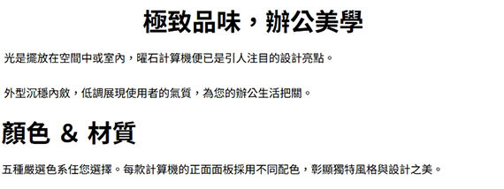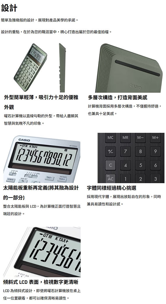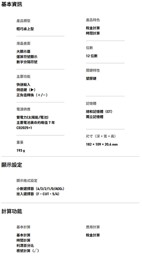 12位數,傾斜式 LCD 表面,輕巧桌上型,太陽能板重新再定義,多層次構造,基本計算,時間計算,利潤百分比,根號計算,稅金計算,尺寸(深*寬*高)182*109*20.4 mm,雙電力(太陽能/電池) BSMI認證碼: D33C78