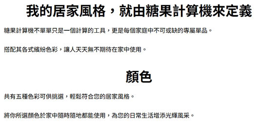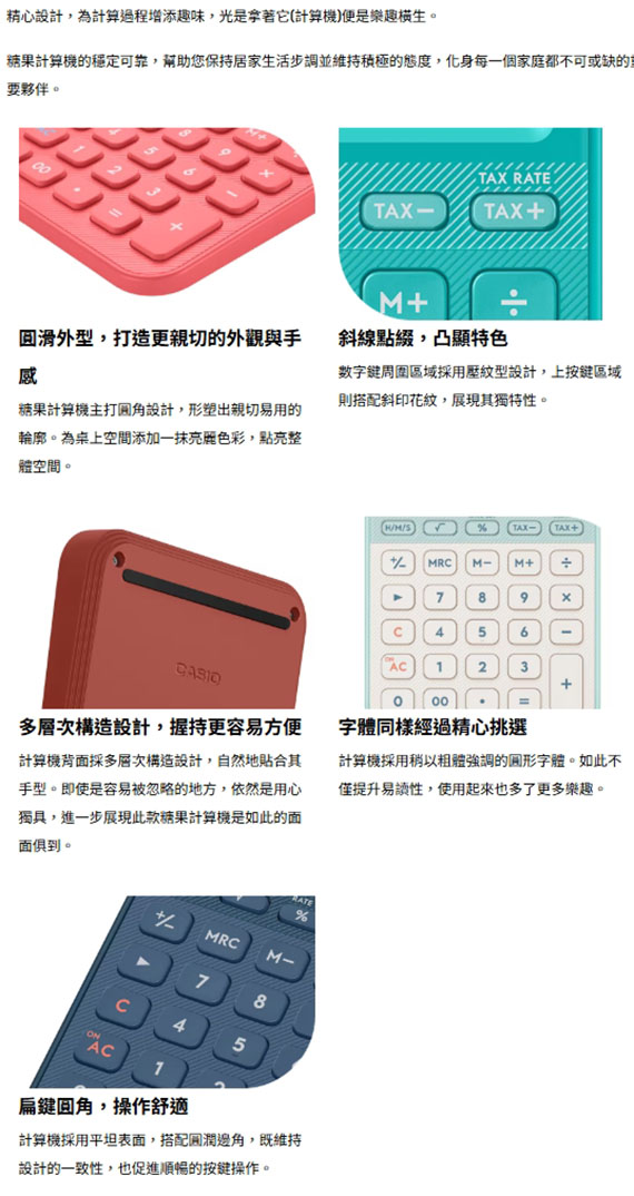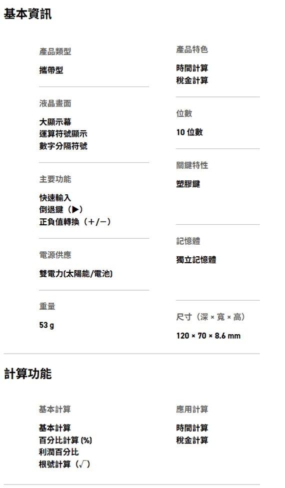 10位數,獨立記憶體,快速輸入,倒退鍵,正負值轉換,時間計算,稅金計算,大顯示幕,運算符號顯示,數字分隔符號,雙電力(太陽能/電池),尺寸(深*寬*高)120*70*8.6 mm