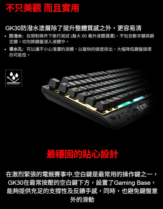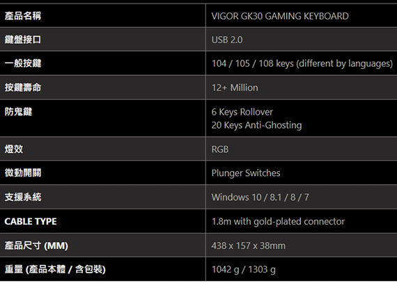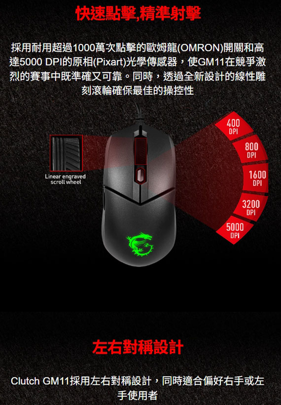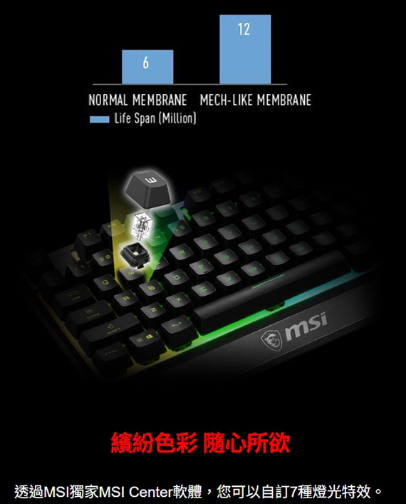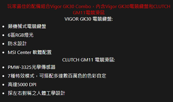 鍵盤(GK30):USB2.0介面、機械軸、104鍵、線長1.8公尺、三層結構類機械軸體、6區RGB燈光、防潑水及導水孔設計、獨家MSI Center軟體、滑鼠(GM11):USB2.0介面、PMW-3325光學傳感器、解析度5000dpi、左右對稱設計、7種特效模式、石墨黑流線型外觀和雙注塑成形技術、採用耐用超過1000萬次點擊的歐姆龍(OMRON)開關、支援DRAGON CENTER、1年保固
