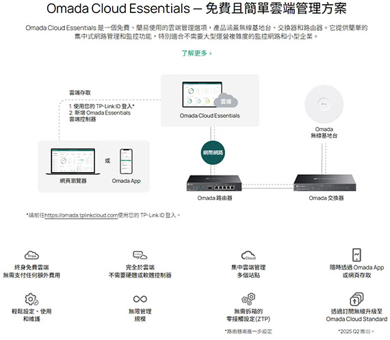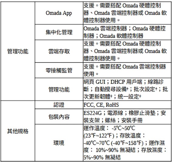 †這些功能需要使用 Omada SDN 控制器。零接觸設定需要使用 Omada 雲端控制器(Omada Cloud Standard 或 Omada Cloud Essentials) 。前往 Omada 雲端控制器(Omada Cloud Standard)產品列表 或 Omada Cloud Essentials 產品列表 來確認哪些設備相容。