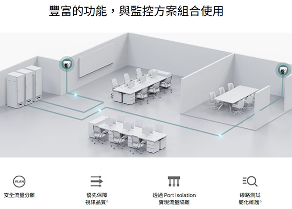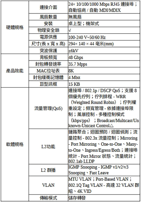 提供10/100/1000Mbps自適應RJ45端口*24,支援自動MDI/MDIX,支援隨插即用,自動迴圈預防,IGMP Snooping,耐用的金屬外殼,無風扇,安靜運行,桌上型/壁掛式安裝設計