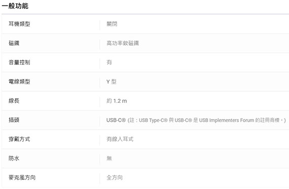 入耳式(耳道),TYPE-C連接,支援UAC1.0,具麥克風可通話,線控功能適用於智慧型裝置,線長1.2m