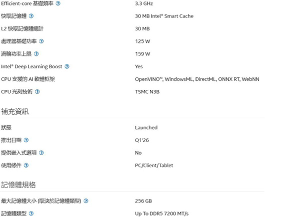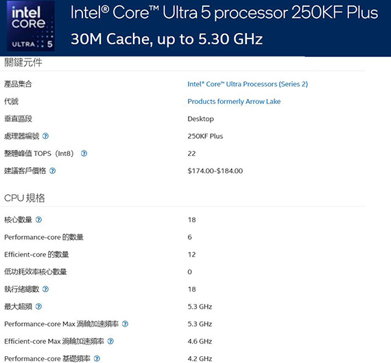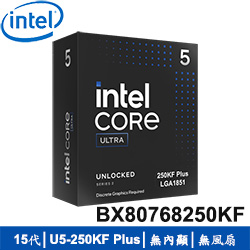 INTEL英特爾 Core Ultra 5 250KF Plus LGA1851/18核18緒/3.3~5.3GHz/30M快取/無內顯/125W/三年保(無風扇)