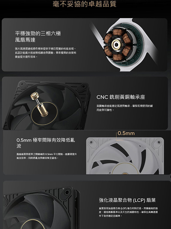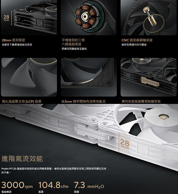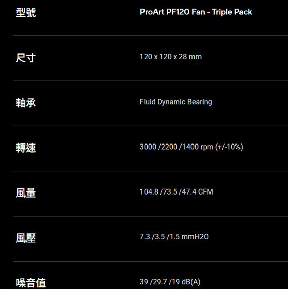尺寸:120x120x28mm,風量(氣流):104.8/73.5/47.4 CFM,轉速:3000/2200/1400rpm(+/-10%),風壓:7.3/3.5/1.5mmH2O,噪音值39/29.7/19dB(A),電壓12V,28mm風扇框架,三相六極馬達,CNC 銑削黃銅軸承座,液晶聚合物(LCP)扇葉,0.5mm 極窄扇葉間隙,專利串聯接頭,5年保固