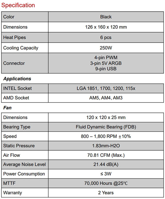 腳位:LGA 1851/1700/1200/115x、AMD AM5/AM4/AM3,風扇規格120*120*25mm,轉速800–1800RPM±10%,最大氣壓1.39mm-H2O,最大氣流63.62CFM,噪音值平均21.19dB(A),尺寸120*126*160mm,6根熱導管,流體動壓軸承(FDB),數位顯示面板,ARGB燈效,XPG Prime軟體,保固2年