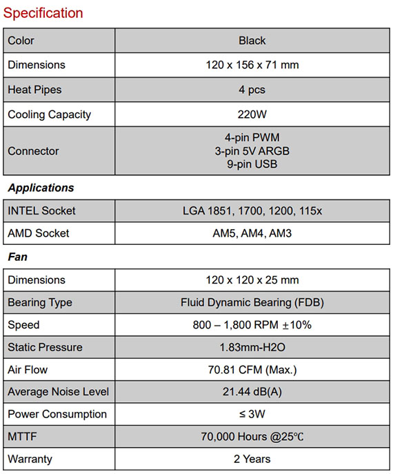 腳位:LGA 1851/1700/1200/115x、AMD AM5/AM4/AM3,風扇規格120*120*25mm,轉速800–1800RPM±10%,最大氣壓1.39mm-H2O,最大氣流63.62CFM, 噪音值平均21.19dB(A),尺寸120*156*71mm,4根熱導管,流體動壓軸承(FDB),數位顯示面板,ARGB燈效,XPG Prime軟體,保固2年