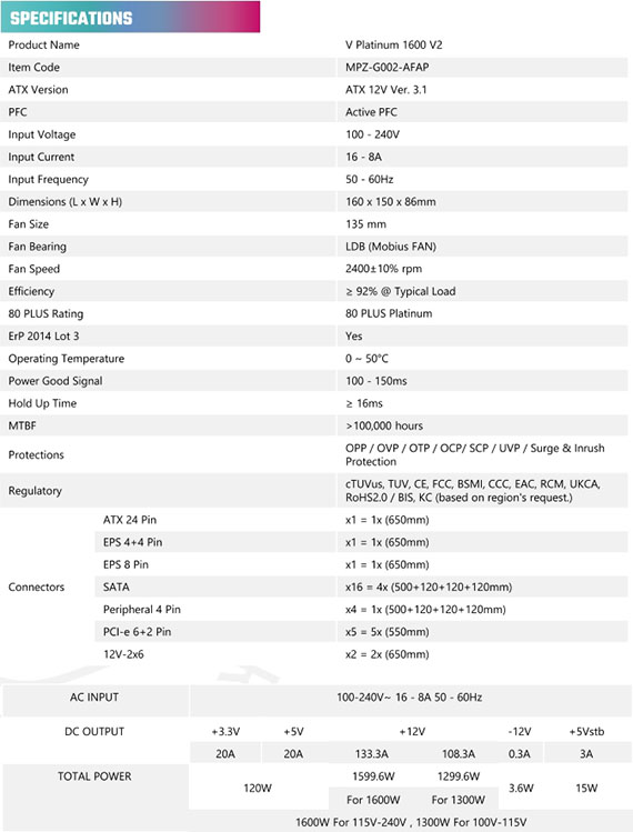 1600W,80PLUS白金牌,全模組化線材,ATX 12V Ver. 3.1,搭載超靜音Mobius風扇,保護性敷形塗層散熱片,智慧溫控,零轉速風扇模式,保護機制OPP/OVP/OTP/OCP/SCP/UVP/Surge & Inrush Protection,ATX 24 Pin*1,EPS 4+4 Pin*1,EPS 8 Pin*1,SATA*16,周邊 4 Pin*4,PCI-e 6+2 Pin*5,12V-2x6*2,12年有限保固