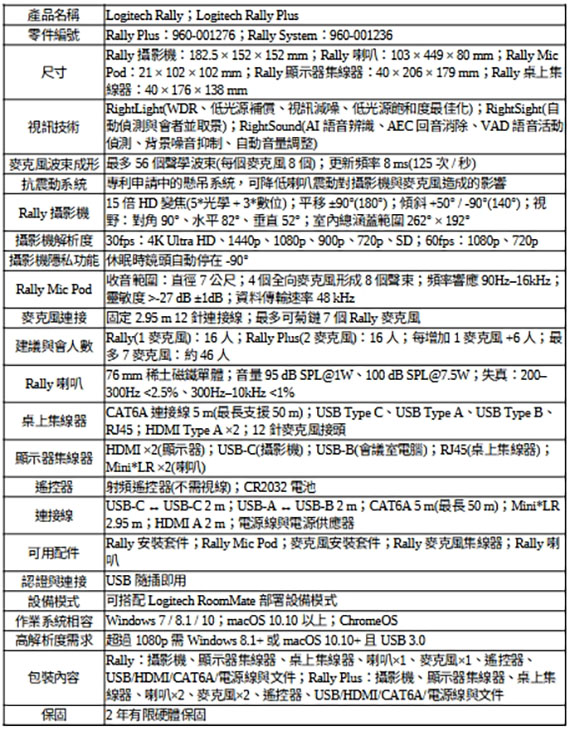 攝影機:4K@30fps,Ultra-HD 成像系統支援,鏡頭角度:平移±90°,傾斜+50°/-90°,視野:90度,Rally 麥克風:收音範圍4.5 公尺直徑,回音消除,背景噪音抑制,Rally 喇叭:高效能 76 公釐稀土磁鐵單體,喇叭音量 95dB SPL @1W,100dB SPL @7.5W,Rally 桌上集線器:隨附連接到 Rally 顯示器集線器的單一 5 公尺 CAT6A 連接線,Rally 顯示器集線器,保固兩年,960-001276