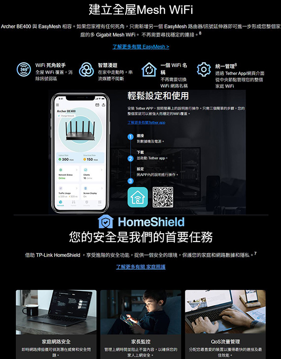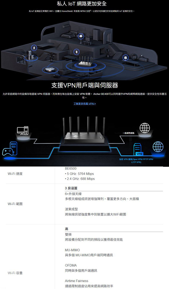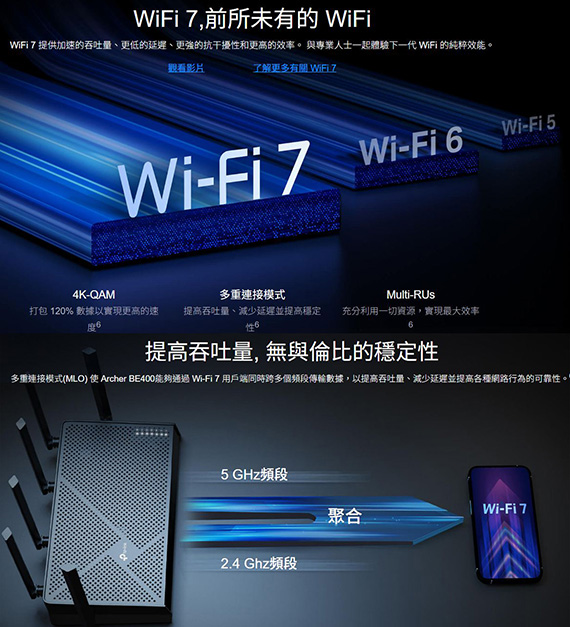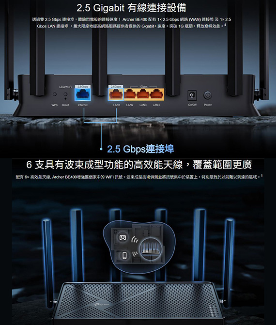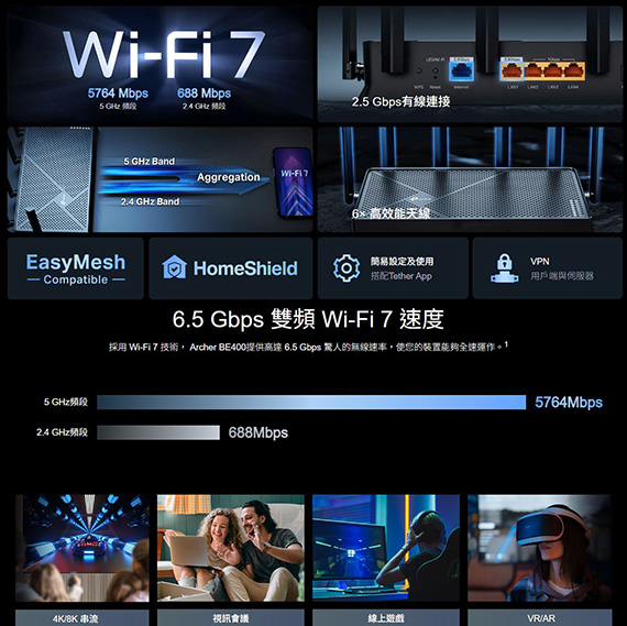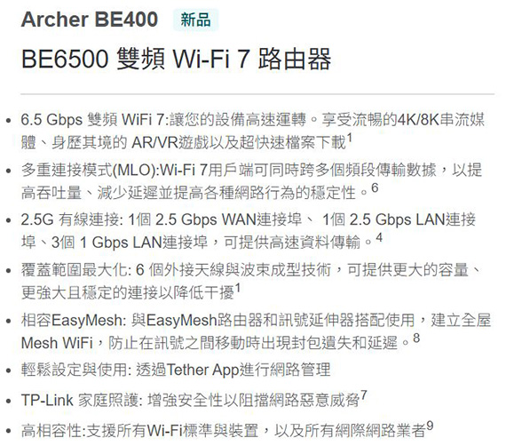 TP-Link Archer BE400 BE6500 雙頻Wi-Fi7路由器