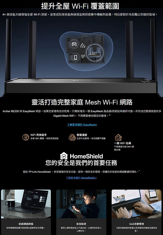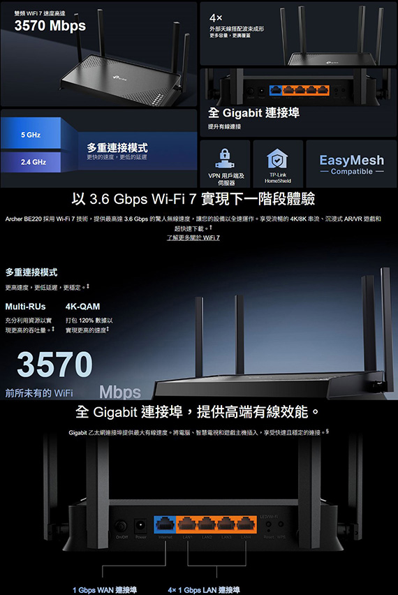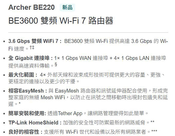 TP-Link Archer BE220 BE3600 雙頻Wi-Fi7路由器