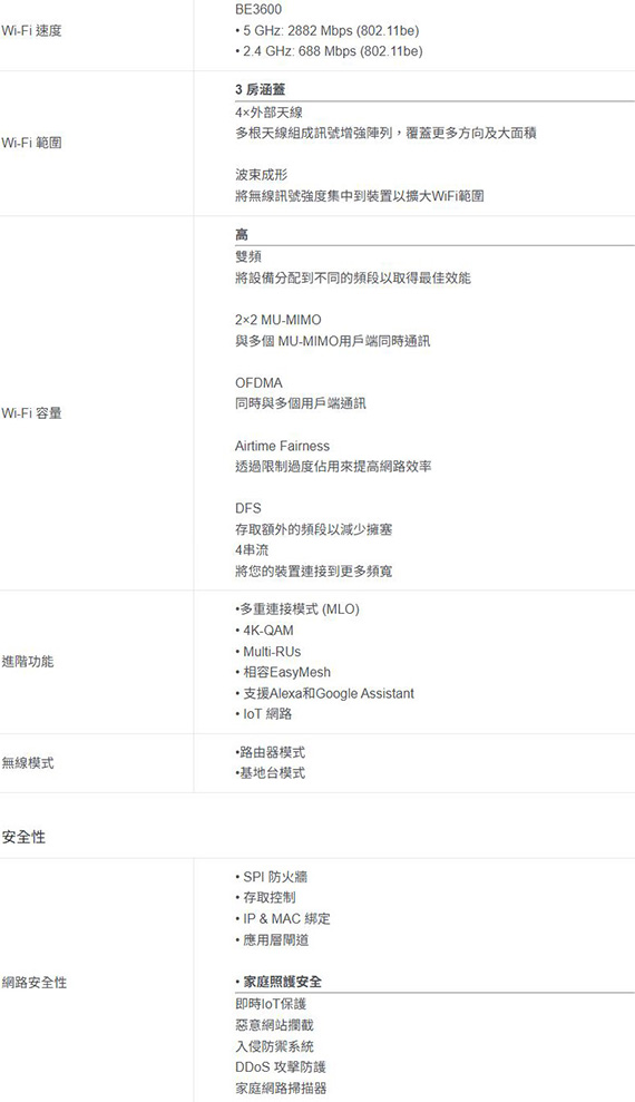 2.4GHz/5GHz雙頻,Wi-Fi7(802.11be)網路標準,無線傳輸速率高達約3600Mbps(2.4GHz:688Mbps,5GHz:2882Mbps),介面1×1Gbps WAN,4×1Gbps LAN,4×外部天線,波束成形,3.6Gbps雙頻,相容EasyMesh,透過Tether App讓網路管理變得如此簡單,TP-Link HomeShield,良好的相容性,三年保固 NCC認證碼: CCAH25LP2490T9 BSMI認證碼: D38330