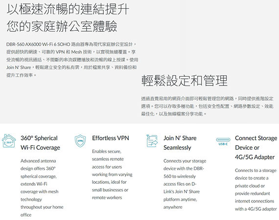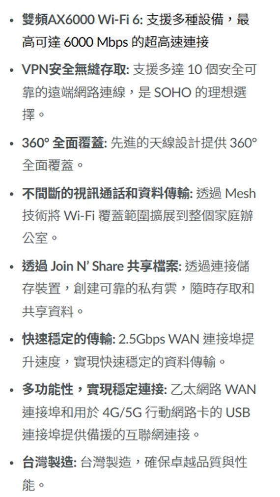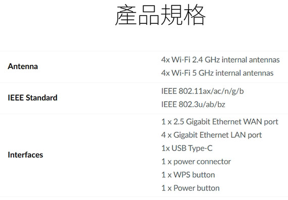 內建管理功能,商務 VPN,防火牆,最高可達6000 Mbps的超高速連接,先進的天線設計提供360°全面覆蓋,2.5Gbps WAN連接埠提升速度,1*2.5千兆乙太網路WAN端口,4*千兆乙太網路LAN端口,1*USB Type-C,不間斷的視訊通話和資料傳輸,透過 Join N’ Share 共享檔案, 2.5Gbps WAN 連接埠提升速度,多功能性,實現穩定連,台灣製造