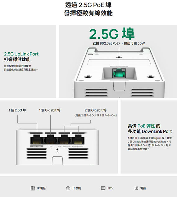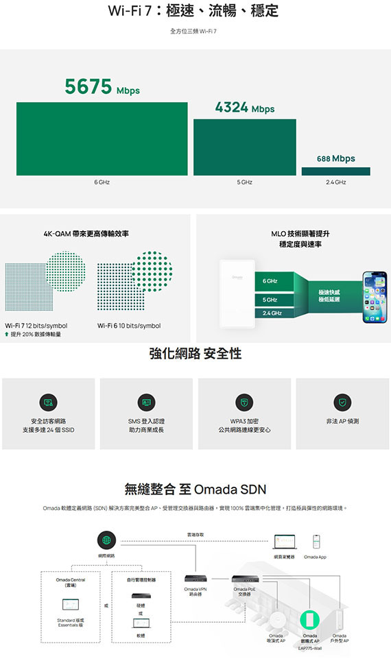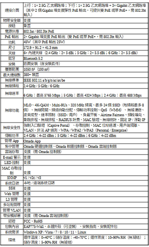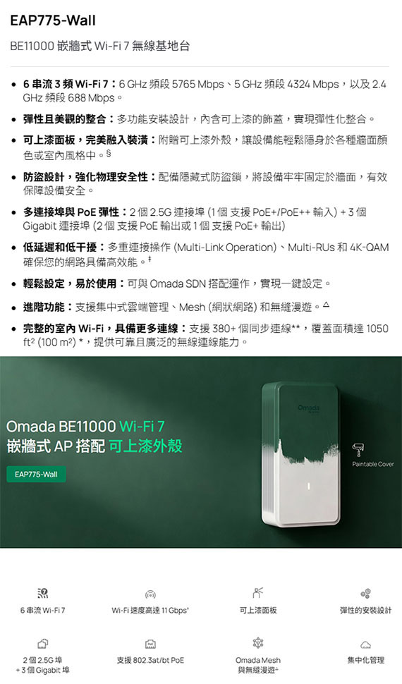 6GHz/5GHz/2.4GHz,6串流3頻Wi-Fi 7,IEEE 802.11 a/b/g/n/ac/ax/be,無線網路速度高達約10777Mbps(2.4GHz 688Mbps+5GHz 4324Mbps+6GHz 5765Mbps),320MHz頻寬,380+同時連線用戶數,集中式雲端管理、Mesh和無縫漫遊,彈性且美觀的整合,可上漆面板完美融入裝潢,防盜設計,強化物理安全性,2*2.5G連接埠,3*Gigabit連接埠,低延遲和低干擾,輕鬆設定,覆蓋面積達100 m2,提供可靠且廣泛的無線連線能力 NCC認證碼: CCAH24LPD270T0 BSMI認證碼: R38330