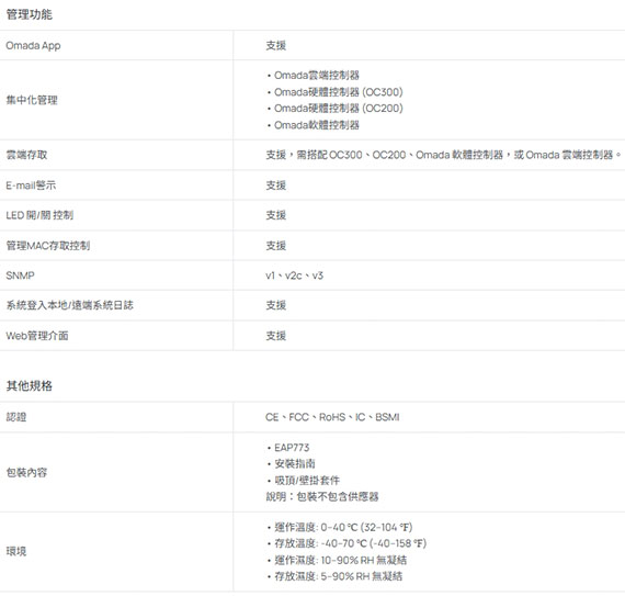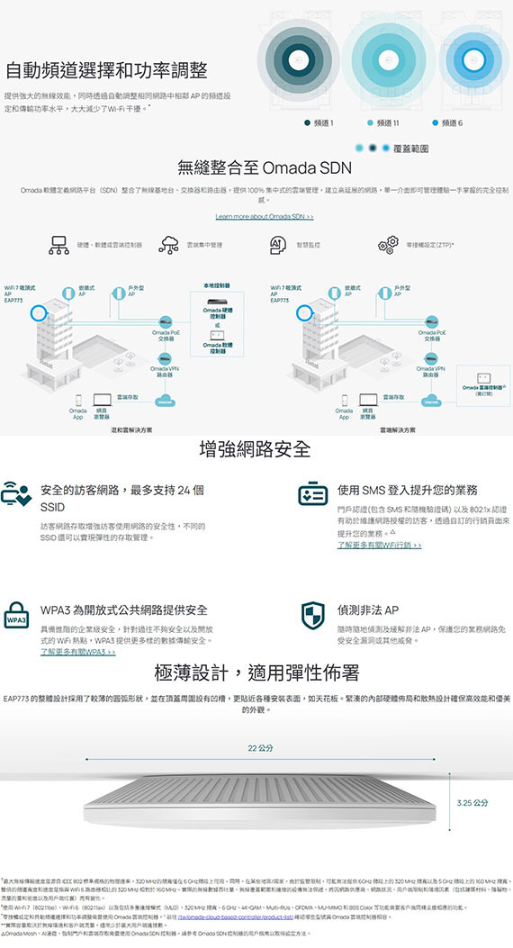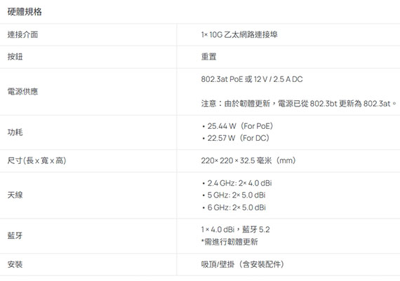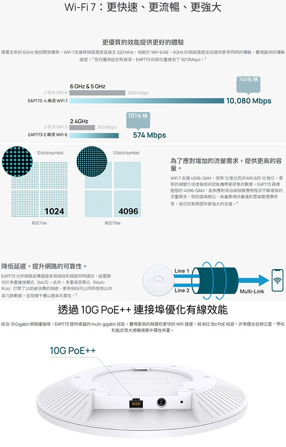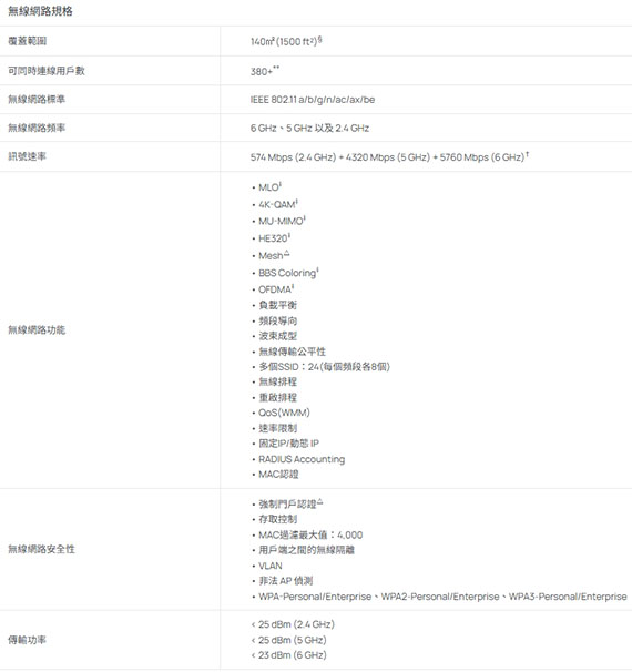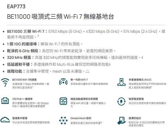2.4GHz/5GHz/6GHz,BE11000三頻Wi-Fi 7,IEEE 802.11 a/b/g/n/ac/ax/be,無線網路速度高達約10654 Mbps(2.4GHz 574Mbps+5GHz 4320Mbps+6GHz 5760Mbps),320MHz頻寬,380+同時連線用戶數,支援集中管理、mesh及AI漫遊,1*10G乙太網路連接埠,乾淨的6GHz頻段,多連接操作和Multi-RUs確保您的網路高效能 NCC認證碼: CCAL24LP0080T2