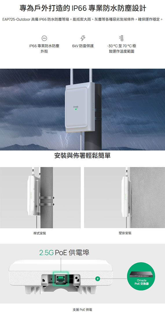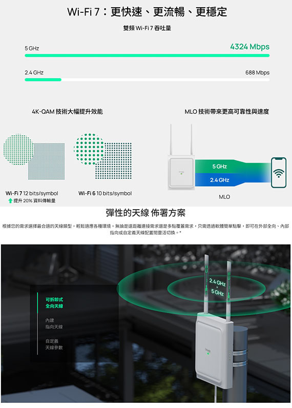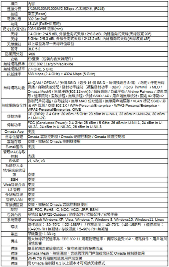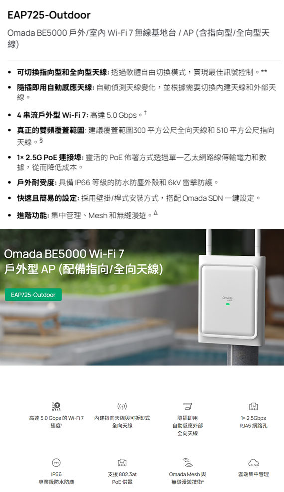2.4GHz/5GHz同步雙頻,4串流戶外型Wi-Fi 7,IEEE 802.11a/g/b/n/ac/ax/be,無線網路速度高達約5012Mbps(2.4GHz 688Mbps+5GHz 4324Mbps),多個SSID(最多16個SSID,每個頻段各8個),1*2.5G PoE連接埠,可切換指向型和全向型天線,隨插即用,建議覆蓋範圍300平方公尺全向天線和510平方公尺指向天線,具備IP66等級的防水防塵外殼和6kV雷擊防護,壁掛/桿式安裝,Omada SDN一鍵設定,集中管理、Mesh和無縫漫遊