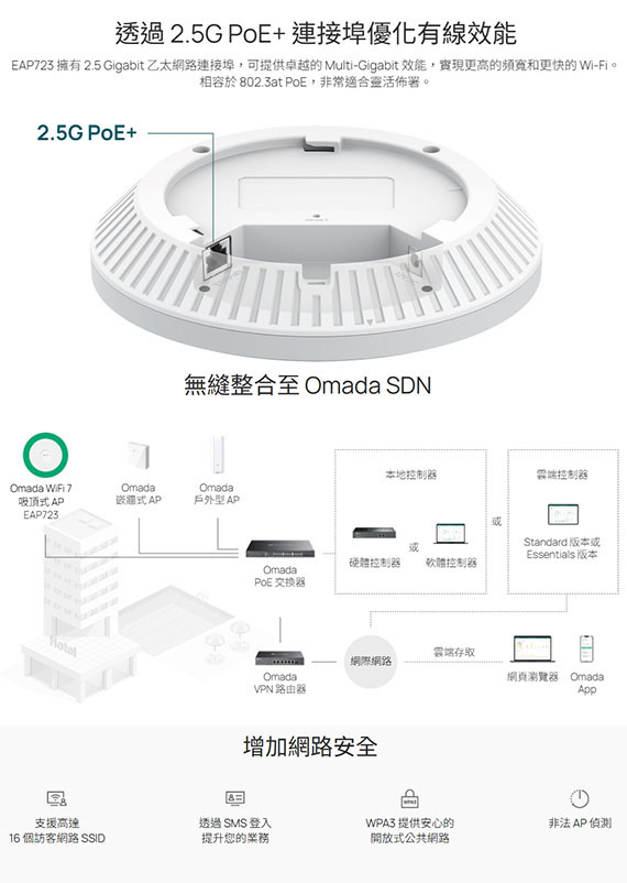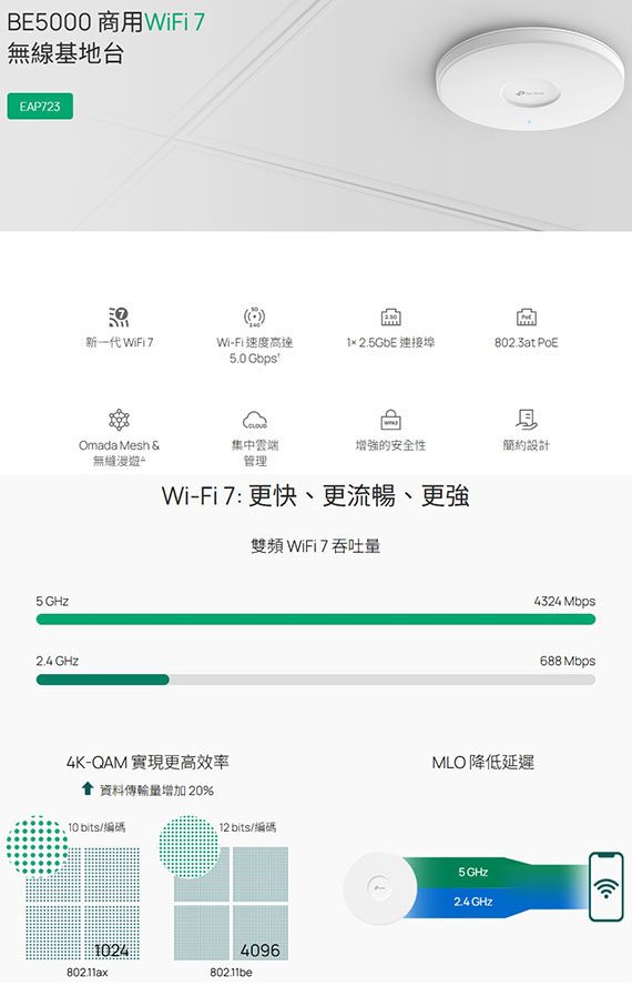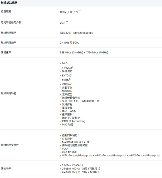 2.4GHz/5GHz同步雙頻,BE5000雙頻Wi-Fi 7,IEEE 802.11 a/b/g/n/ac/ax/be,無線網路速度高達約5012Mbps(2.4GHz 688Mbps+5GHz 4324Mbps),240MHz頻寬,250+同時連線用戶數,集中管理、Mesh和無縫漫遊,1*2.5G乙太網路連接埠,Multi-RUs確保網路的高效能 NCC認證碼: CCAH24LPA230T9 BSMI認證碼: D38330