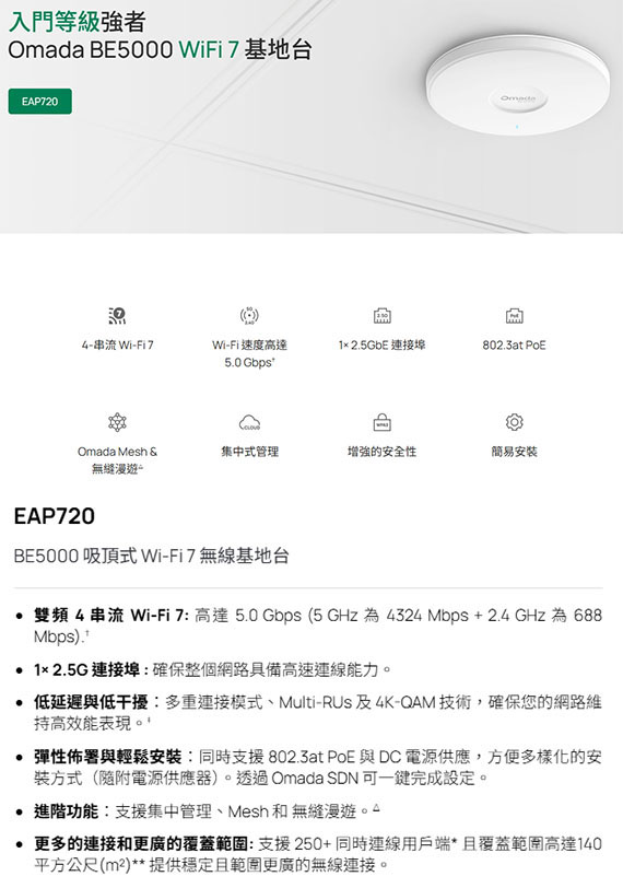 TP-Link EAP720 BE5000 吸頂式 Wi-Fi7 無線基地台