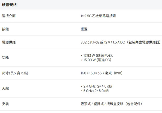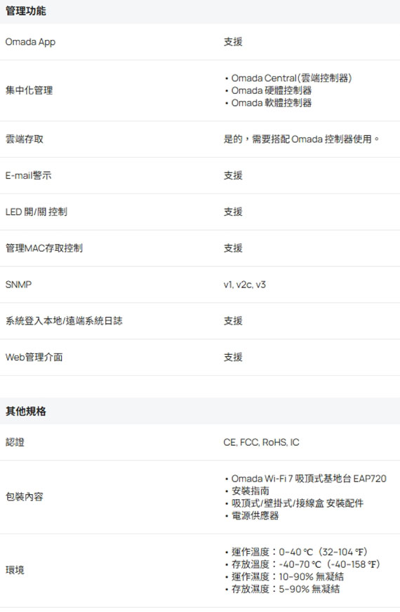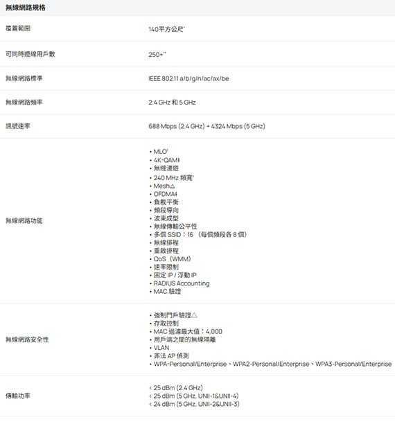 2.4GHz/5GHz同步雙頻,雙頻4串流Wi-Fi 7,IEEE 802.11 a/b/g/n/ac/ax/be,無線網路速度高達約5012Mbps(2.4GHz 688Mbps+5GHz 4324Mbps),240 MHz頻寬,250+同時連線用戶數,支援集中管理、Mesh和無縫漫遊,1*2.5G乙太網路連接埠,多重連接模式、Multi-RUs及4K-QAM技術,同時支援802.3at PoE與DC電源供應,Omada SDN可一鍵完成設定,覆蓋範圍高達140平方公尺提供穩定且範圍更廣的無線連接 NCC認證碼: CCAH25LP3611T0 BSMI認證碼: R38330