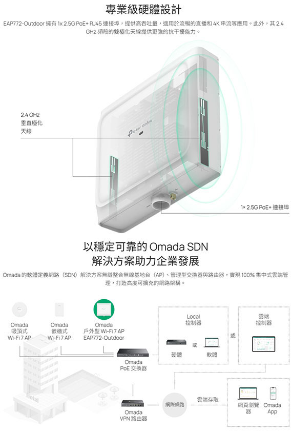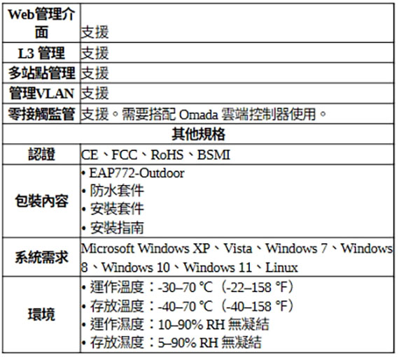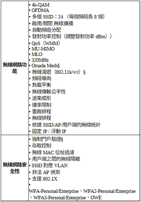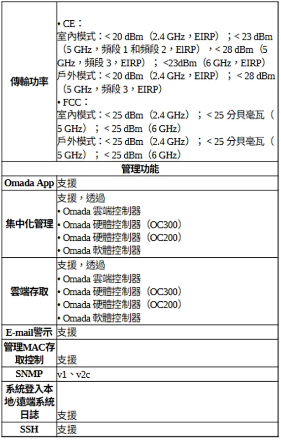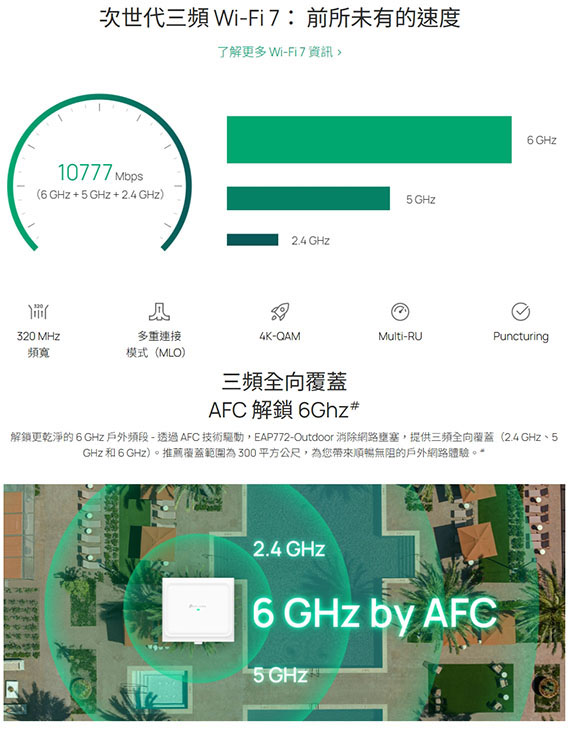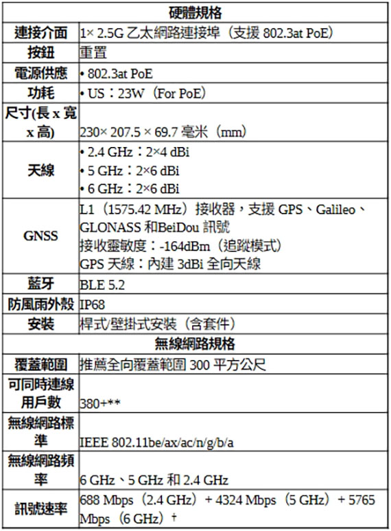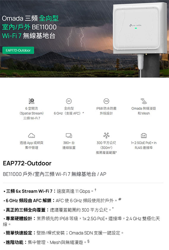 2.4GHz/5GHz/6GHz,三頻6*Stream Wi-Fi 7,IEEE 802.11be/ax/ac/n/g/b/a,無線網路速度高達約10777Mbps(2.4GHz 688Mbps+5GHz 4324Mbps+6GHz 5765Mbps),320MHz頻寬,380+同時連線用戶數,集中管理、Mesh與無縫漫遊,1*2.5G乙太網路連接埠,6GHz頻段由AFC解鎖,建議覆蓋範圍約300平方公尺,業界領先的IP68等級硬體設計,2.4GHz雙極化天線,壁掛/桿式安裝,Omada SDN支援一鍵設定 NCC認證碼: CCAH24LPE090T0