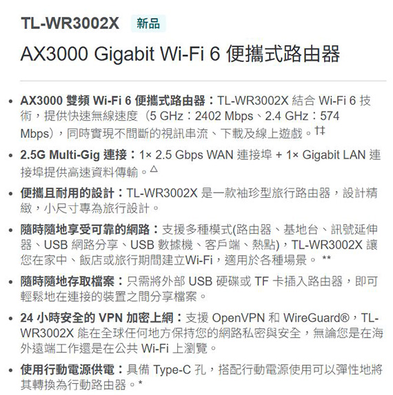 TP-Link TL-WR3002X AX3000 Gigabit Wi-Fi 6 便攜式路由器