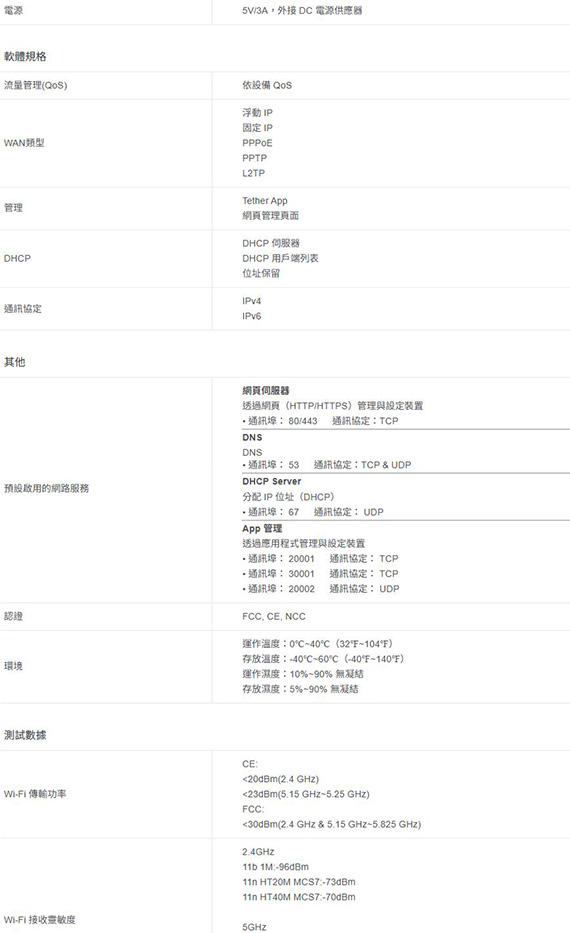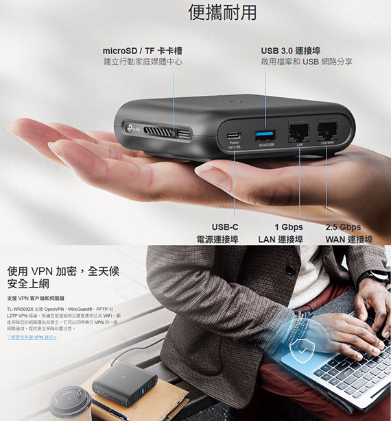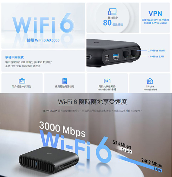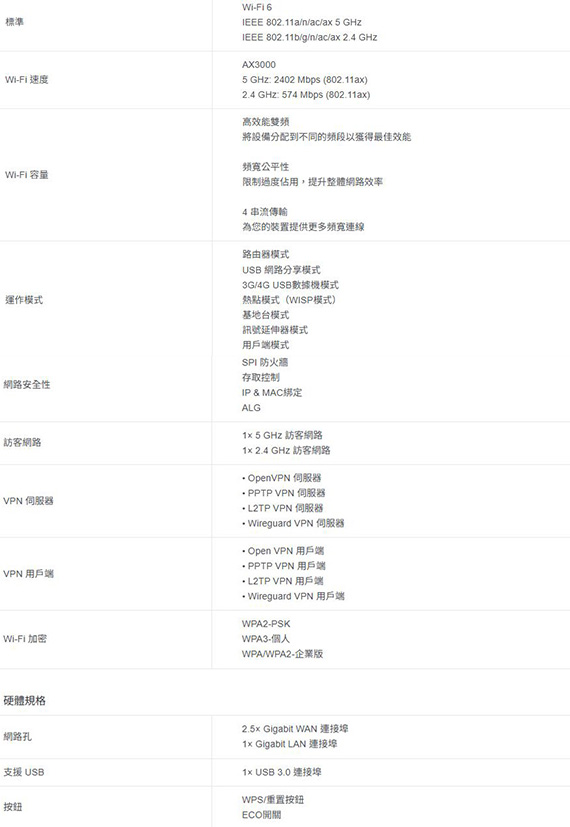 2.4GHz/5GHz雙頻,WiFi6(802.11ax)網路標準,無線傳輸速率高達約2980Mbps(2.4GHz:574 Mbps,5GHz:2402Mbps),介面2.5×Gigabit WAN連接埠,1×Gigabit LAN連接埠,1×USB 3.0連接埠,便攜且耐用的設計,Tether App網頁管理頁面,隨時隨地存取檔案,24小時安全的VPN加密上網,尺寸(W×D×H):10.5×9.13×3公分,三年保固 NCC認證碼: CCAH24LPD860T5