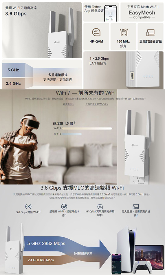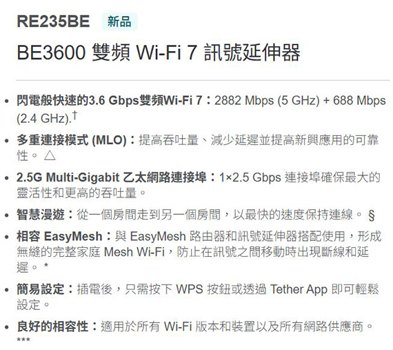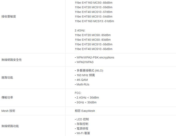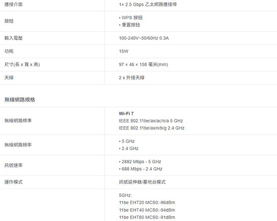 2.4GHz/5GHz雙頻,IEEE 802.11be/ax/ac/n/a 5GHz、IEEE 802.11be/ax/n/b/g 2.4GHz網路標準,,無線傳輸速率高達3570Mbps(5GHz:2882Mbps,2.4GHz:688Mbps),1×2.5Gbps乙太網路連接埠,2x外接天線,WPS按鈕、重置按鈕,WPA/WPA2-PSK encryptions,WPA2/WPA3,多重連接模式(MLO),智慧漫遊,相容EasyMesh,WPS按鈕或透過Tether App即可輕鬆設定,尺寸(長x寬x高):97×46×158mm,三年保固