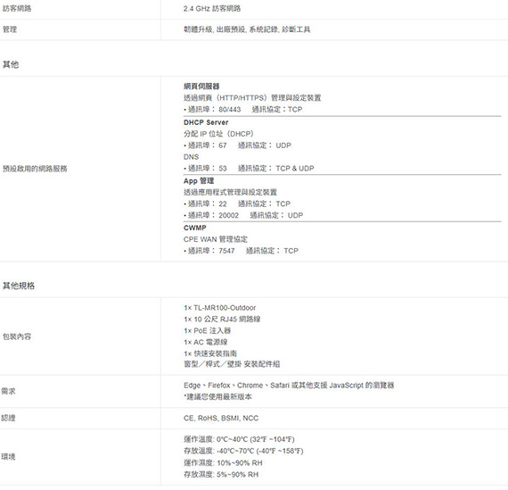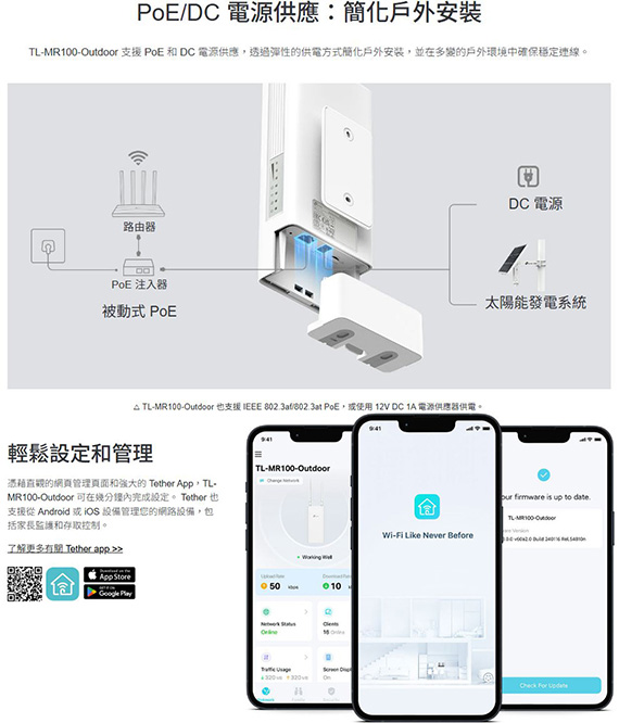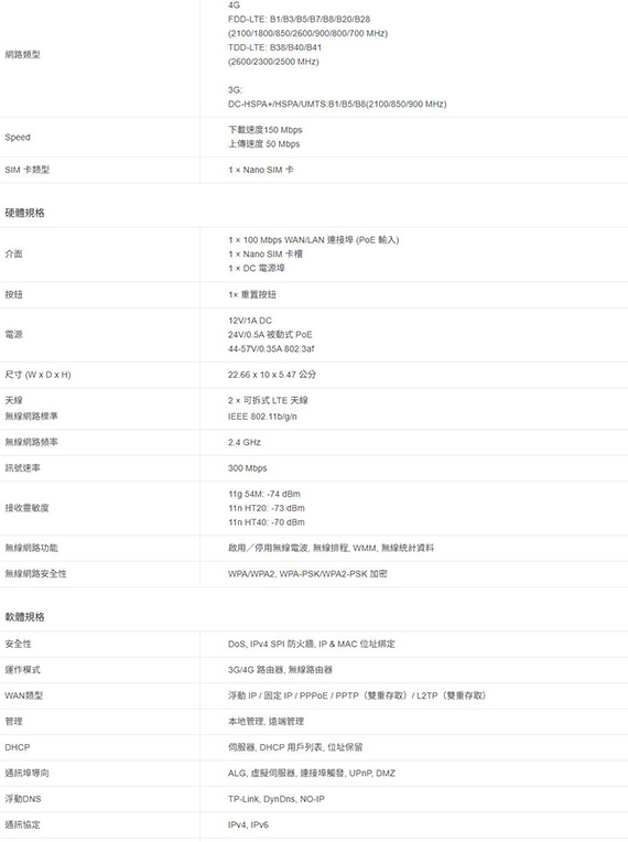 支援2.4GHz頻段,IEEE 802.11b/g/n,傳輸速率最高可達300Mbps(2.4GHz),4G LTE與高速的Wi-Fi連,具有IP65防水防塵,以及±6kV防雷擊與±15kV靜電防護,可透過桿式、壁掛或窗型安裝,靈活且方便的安裝於各種位置,PoE/DC 電源供應,隨插即用,透過Tether App輕鬆設定與管理網路,介面:1×100 Mbps WAN/LAN 連接埠(PoE 輸入),1×Nano SIM卡槽,1×DC電源埠,三年保固 NCC認證碼: CCAH254G0230T6