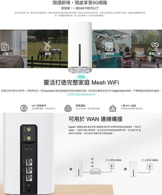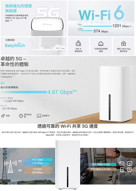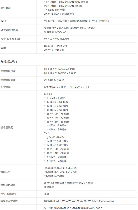 2.4GHz/5GHz雙頻,最新的無線技術Wi-Fi 6,無線網路速度高達1775Mbps(2.4GHz 574Mbps+5GHz 1201Mbps),8×5G/LTE 內建天線,2×Wi-Fi內建天線,介面:1×10/100/1000 MbpsLAN/WAN連接埠,2×10/100/1000 Mbps LAN連接埠,1×Nano SIM卡槽,2×外接 SMA-F天線連接埠,提升5G速度,相容EasyMesh,可用於WAN連線備援,三年保固 NCC認證碼: CCAH245G0140T4